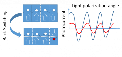 Short-circuit photocurrent due to bulk photovoltaic effect displays an oscillatory dependence on the polarization state of light. Here, we explore how the ferroelectric polarization direction in h-LuMnO3 crystals affects the oscillating short-circuit photocurrent. It is shown that after prepoling the crystal at saturation, at remanence, the direction and amplitude of photocurrent oscillations are no longer dictated by prepoling voltage but are largely modulated by polarization back-switching, here ruled by the imprint field.